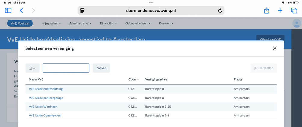 - Het is zaak de juiste onder-VvE te kiezen, gebruik hiervoor de "Wissel van VVE" knop rechtsboven. Hierbij heeft u de keuze uit meerdere opties - welke voor u zichtbaar zijn hangt af waar u (mede)eigenaar van bent: