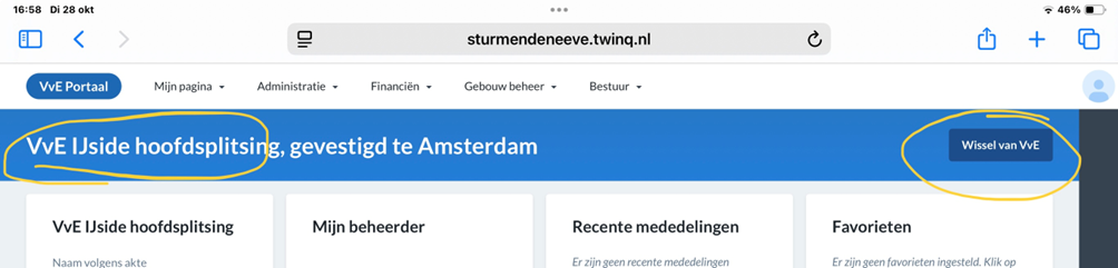 (de huidige geselecteerde VvE staat ook altijd bovenin in de blauwe balk).