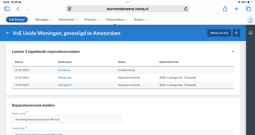 - Kijk altijd even eerst of iemand anders misschien al dezelfde melding heeft gedaan: kies in het menu boven "Gebouw beheer" en vervolgens “Reparatieverzoeken en opdrachten”.