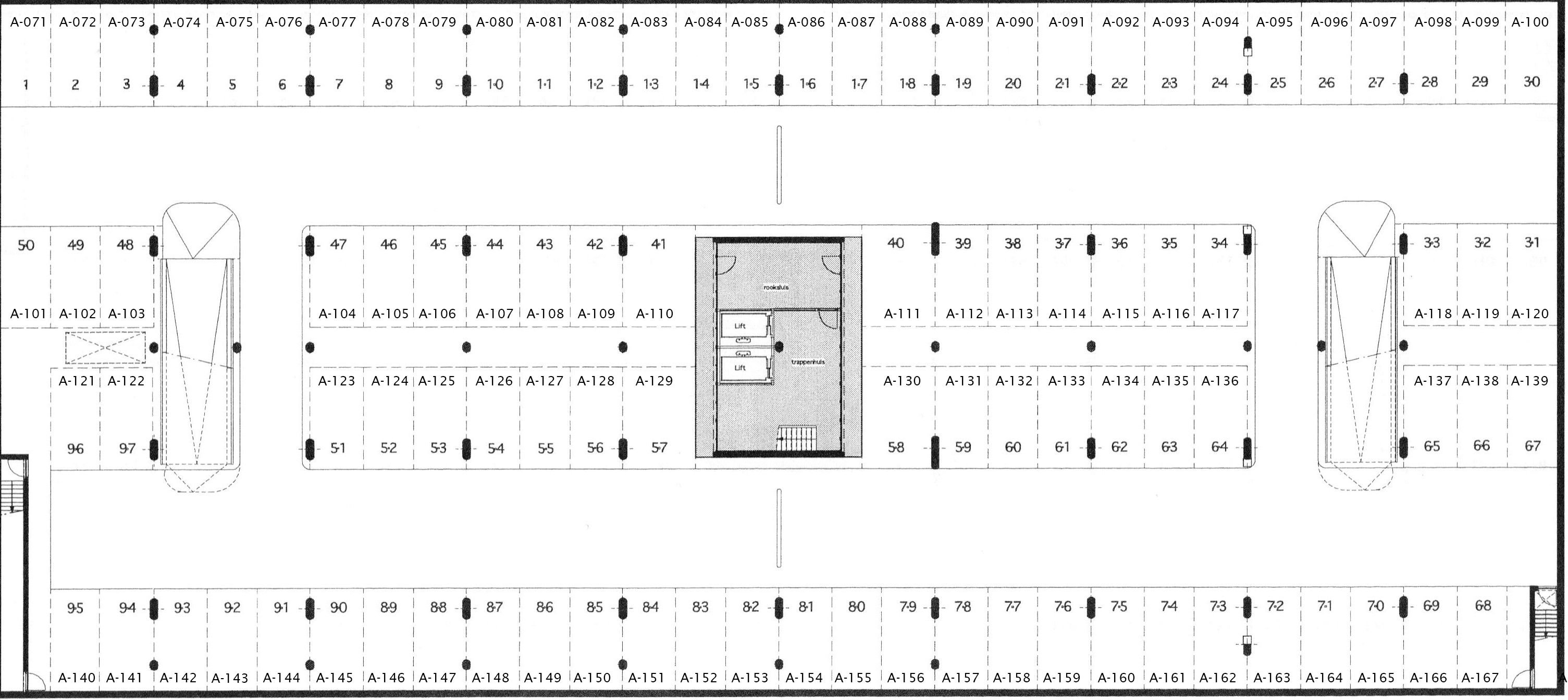 De nummering op de vloer van de parkeergarage zijn de bouwnummers die tijdens de bouw zijn toegewezen. In de splitsingsakte van de garage wordt ook gesproken van kadasternummers (in de vorm A-xxx), deze komen niet overeen. Zie de bijlagen bij deze pagina voor een plattegrond van met bouwnummers en kadasternummers, de oorspronkelijke plattegrond met kadasternummers, en de splitsingsakte zelf.